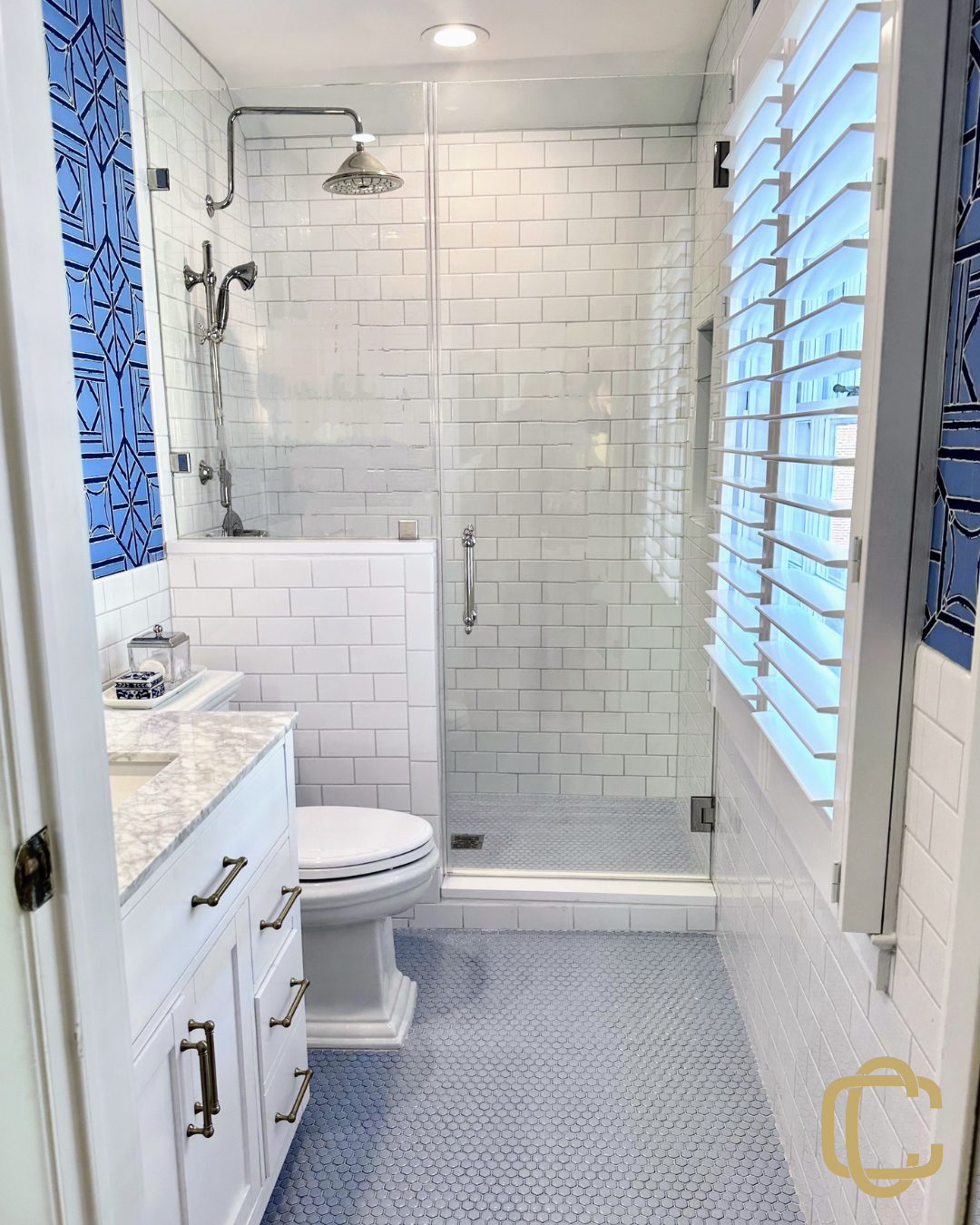 By thoughtfully relocating plumbing, we rebalanced the layout by expanding the hall bathroom while preserving the integrity of the larger master bath. The hall closet was removed to make room for a water closet in the master bathroom, while replacing the original bathroom closet. We reimagined these bathrooms entirely, reshaping the space to feel more balanced and functional. Every detail from the floors to the fixtures was updated to feel classic and clean yet bold and modern.